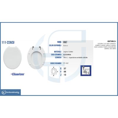 Il Copriwater per Azzurra Vaso Cult (forma di tipo 1, cerniere tipo C) ècompatibile con i WC di casa ceramica Azzurra serie Cult e serie Calla. SKU: 111-22ACU
